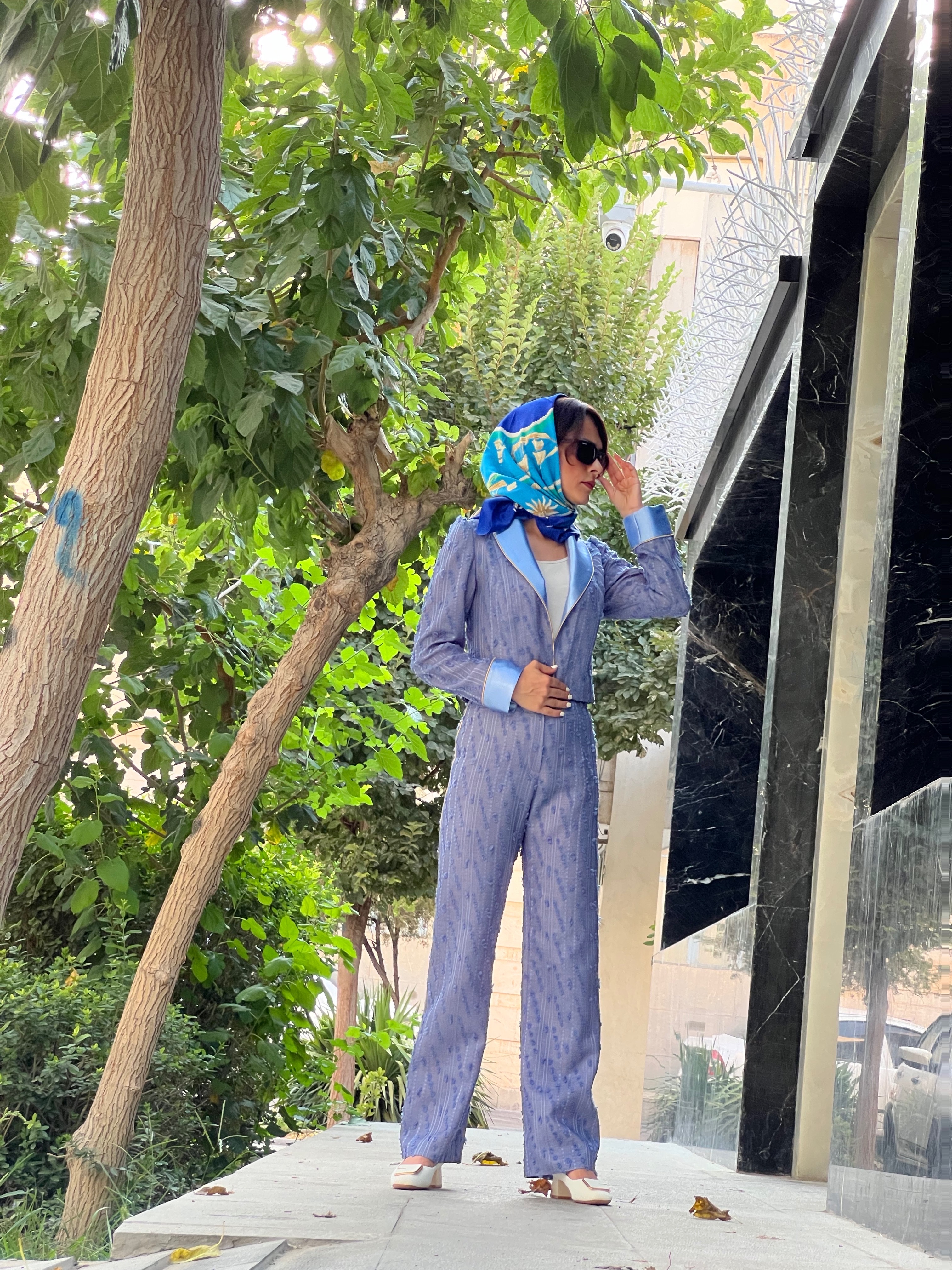 کت و شلوار اورگانزا لایه کوبی شده کامل ترکیبی از پارچه های اورگانزا و ساتن ابی مناسب برای سایز ۳۶ تا ۳۸: تک سایز